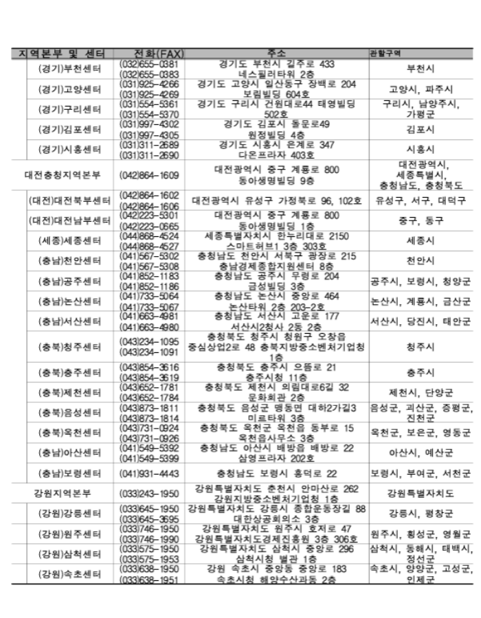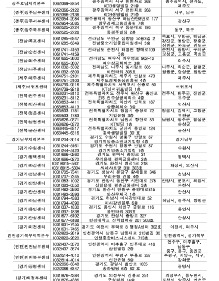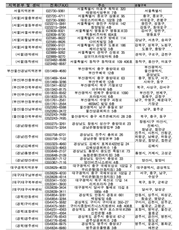 지역별 소상공인 지원센터 지역본부 전화번호와 주소, 관할구역입니다. 거주하고 계신 지역과 관할구역을 확인하신 뒤 해당 전화번호로 연결하시면 소상공인 전기요금 특별지원금 신청방법에 대해 자세히 알려주고 있습니다.